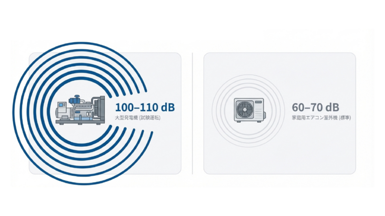 通常の空調室外機の騒音が60〜70dB程度であるのに対し、ディーゼルエンジン式の非常用発電機は機器の近傍(未消音時)で約100dB〜110dBに達することがあります。これは、自動車のクラクションやガード下で電車が通過する時の音に相当するレベルです。