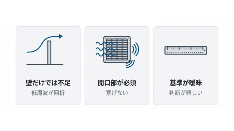 低周波音は波長が長いため、壁や障害物の端を回り込んで裏側にまで伝わります。こうした現象を「回折(かいせつ)」といい、一般的な防音壁が中〜高周波音に10〜15dBの低減効果を発揮するのに対し、低周波音に対してはわずか数dBしか低減できないこともあります。「防音壁を建てたのに苦情が来た」というケースは、この回折の影響が考えられます。